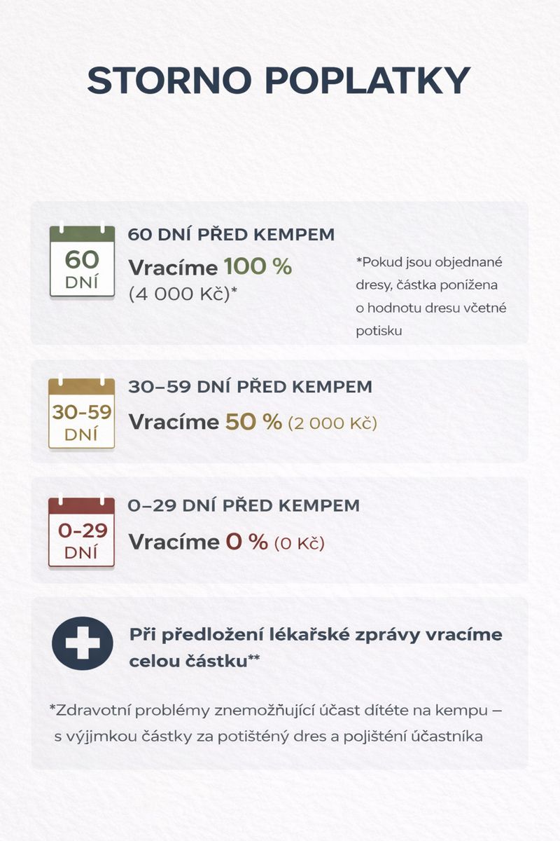-přihlašování je možné pouze do naplnění kapacity (45 dětí na kemp) - registrace budou spuštěny na konci ledna - spuštění registrací bude zveřejněno na FB stránkách a Instagramu kempu!